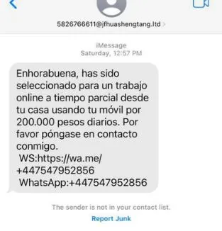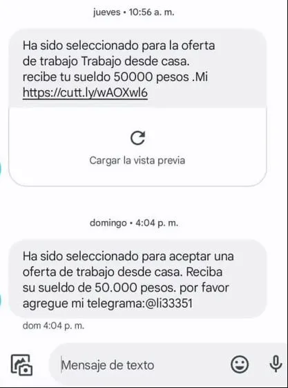 "Has sido seleccionado para una oferta de trabajo desde casa" o "has sido elegido para un trabajo online". Se ha reportado un incremento de este tipo de mensajes con falsas promesas laborales circulando por WhatsApp, Telegram y SMS. Se promete un trabajo, con buenas condiciones y un dinero interesante, pero sólo se trata de un anzuelo para obtener dinero e información personal de las víctimas.