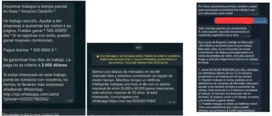 Si la víctima cae en este tipo de engaños, se pone en contacto con el supuesto reclutador y comienza un intercambio por alguno de los servicios de mensajería mencionados. Los estafadores se hacen pasar por empleados de empresas reconocidas, como Mercado Libre, entre otras, para ganarse la confianza del usuario y luego se le empieza a pedir información personal o incluso piden que se hagan transferencias de dinero para supuestos gastos administrativos. Es un tipo de estafa que viene circulando hace tiempo tanto en Latinoamérica como en otras partes del mundo.