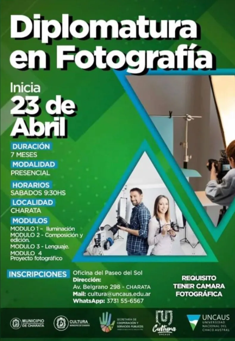 El Municipio de Charata, en conjunto con la Secretaría de Cultura y la Universidad Nacional del Chaco Austral (UNCAUs) ofrece una Diplomatura en Fotografía.