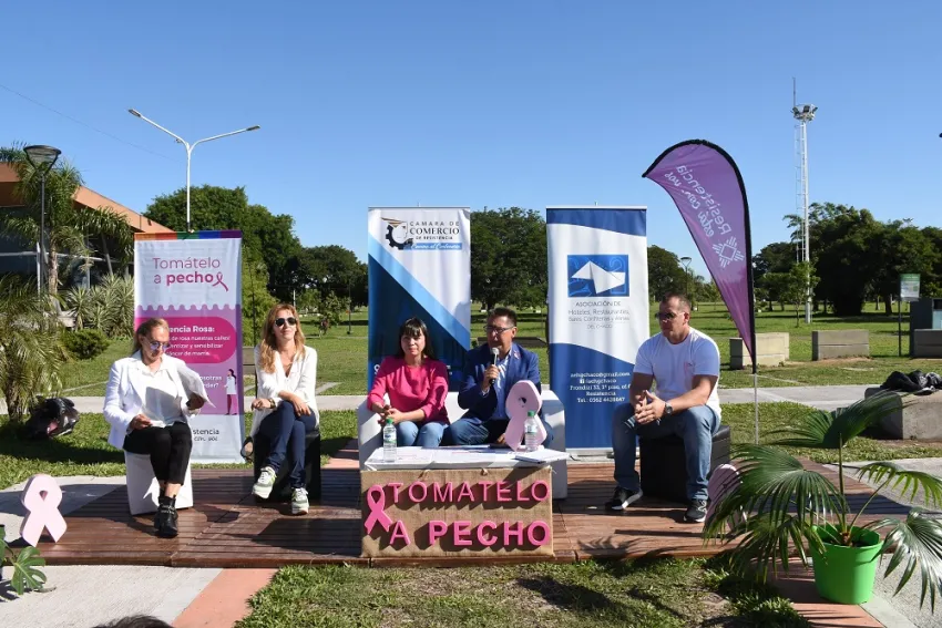 El intendente de Resistencia, Gustavo Martínez, junto a la titular del programa municipal "Tomátelo a Pecho" y secretaria de Desarrollo Humano e Identidad, Laura Balbis, encabezó el lanzamiento de la Maratón Rosa prevista para el sábado 30 de abril en el Parque de la Democracia. La misma es netamente inclusiva y gratuita, con el objetivo central de visibilizar la importancia de la prevención del cáncer de mama bajo el lema "Crear conciencia es la meta".
