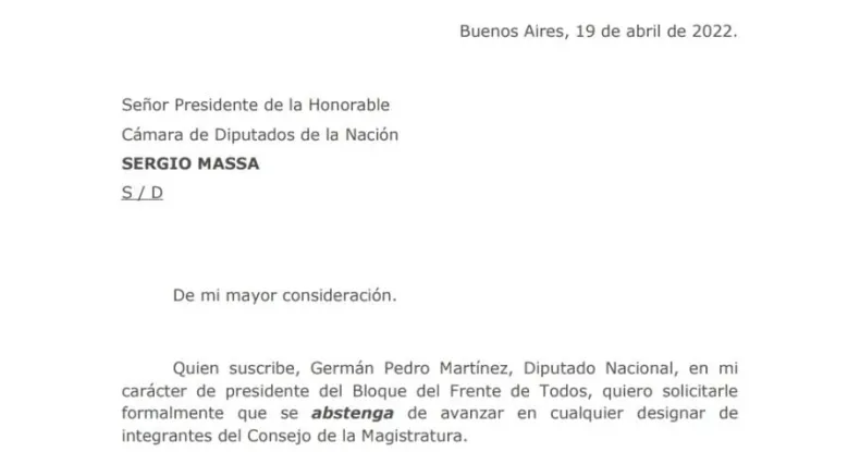 El presidente del bloque Frente de Todos, Germán Martínez, presentó una nota esta noche al presidente de la Cámara de Diputados, Sergio Massa. En la misma le pide que se abstenga de designar a un miembro del Consejo de la Magistratura.