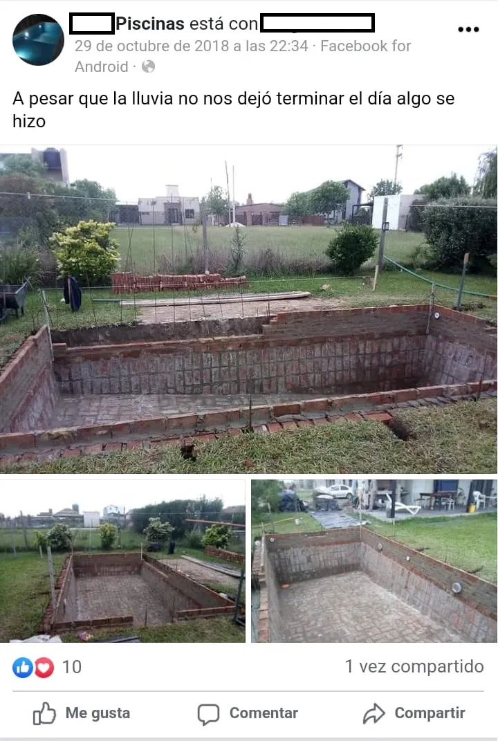 En marzo pasado, un constructor de piletas fue detenido por supuestas estafas. El estafador firmaba contratos con propietarios de viviendas para construir piscinas a muy bajo costo, solicitaba un adelanto y luego dejaba el trabajo por la mitad y desaparecía con el dinero.