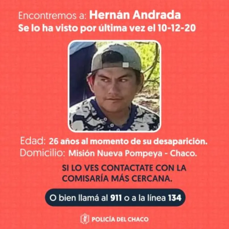 En la tarde de ayer, efectivos policiales realizaron un nuevo operativo de búsqueda el Paraje Nueva Población distante a unos 18 kilómetros de la localidad de Misión Nueva Pompeya, para dar con el paradero de Hernán Andrada, de 26 años, un joven desaparecido desde el 10 de diciembre de 2020.