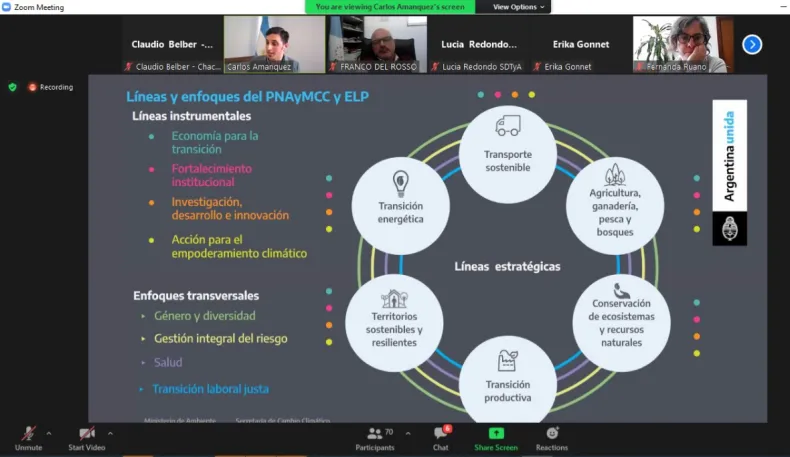 El coordinador del GNCC, Carlos Amanquez, presentó el trabajo realizado en articulación con las provincias. El año pasado fue de consolidación de visiones y estrategias mientras que en 2022 estará puesto en el cierre de los procesos de planificación. También se presentó el cronograma de trabajo planteado para el 2022 por el GNCC para consolidar los objetivos propuestos y el trabajo articulado que se piensa desarrollar con el Consejo Económico y Social. En julio se prevé tener el primer borrador del PNAyMCC. El trabajo con las jurisdicciones se realizará mediante la Mesa de Articulación Provincial, pero también a través de consultas direccionadas y aportes al PNAyMCC.