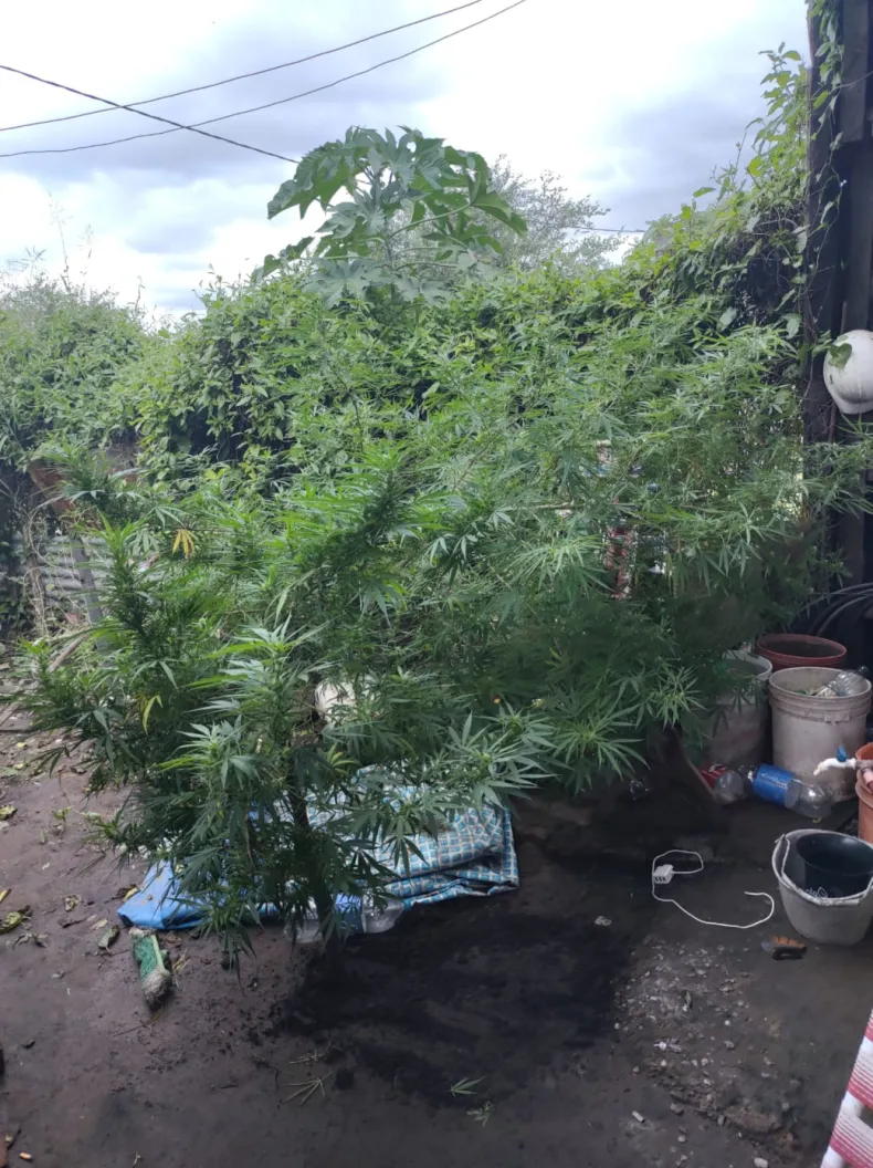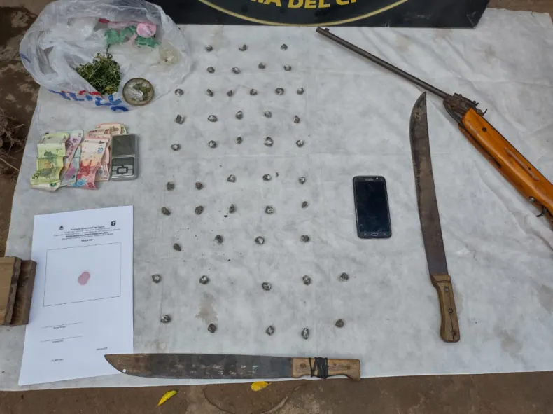 Al llegar al lugar los agentes no lograron encontrar al principal sospechoso, sin embargo, al realizar las requisas de inspección encontraron 47 bochitas con sustancia marihuana que dieron un peso de 42 gramos, 3 plantas cannabis sativa, de 3 metros de altura cada una, un frasco de vidrio con restos de flores de la misma especie, una balanza de precisión, una motocicleta marca Motomel sin dominio, dos machetes y un rifle aire comprimido calibre 5 1/2.