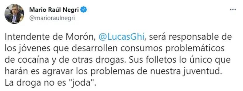 Mario Negri escribió en Twitter: "El Intendente de Morón, @LucasGhi, será responsable de los jóvenes que desarrollen consumos problemáticos de cocaína y de otras drogas. Sus folletos lo único que harán es agravar los problemas de nuestra juventud. La droga no es ‘joda’".