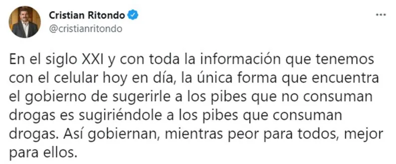 Cristian Ritondo publicó en Twitter: "En el siglo XXI y con toda la información que tenemos con el celular hoy en día, la única forma que encuentra el gobierno de sugerirle a los pibes que no consuman drogas es sugiriéndoles a los pibes que consuman drogas. Así gobiernan, mientras peor para todos, mejor para ellos".