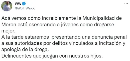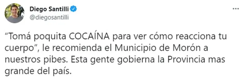 Por su parte, Diego Santilli publicó en Twitter: "Tomá poquita COCAÍNA para ver cómo reacciona tu cuerpo", les recomienda el Municipio de Morón a nuestros pibes. Esta gente gobierna la Provincia más grande del país".