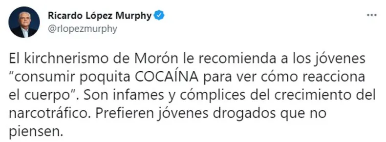 El diputado de Juntos por el cambio Ricardo López Murphy tuiteó: "El kirchnerismo de Morón les recomienda a los jóvenes ‘consumir poquita COCAÍNA para ver cómo reacciona el cuerpo’. Son infames y cómplices del crecimiento del narcotráfico. Prefieren jóvenes drogados que no piensen".