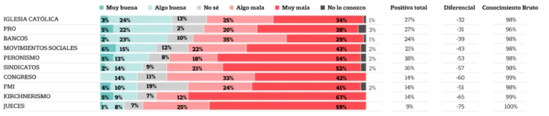 En tanto, los escaños más bajos de la tabla los ocupan el Fondo Monetario Internacional (FMI), el kirchnerismo y los jueces, cuyo concepto es muy bueno para el 4%, 5% y 0% de los entrevistados y muy malo para el 41%, 67% y 59%.