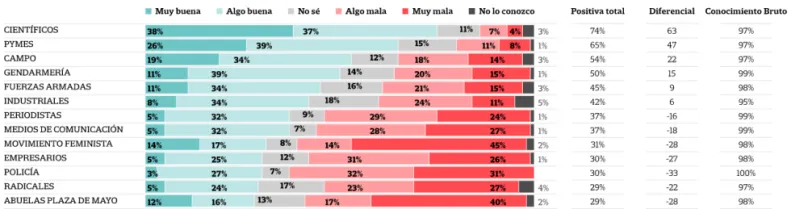 Quienes tienen la mayor imagen positiva son los científicos, las Pymes y el campo, que obtuvieron respectivamente la calificación "Muy buena" en el 38%, 26% y 19% de los casos y "Muy mala" en el 4%, 8% y 14%.