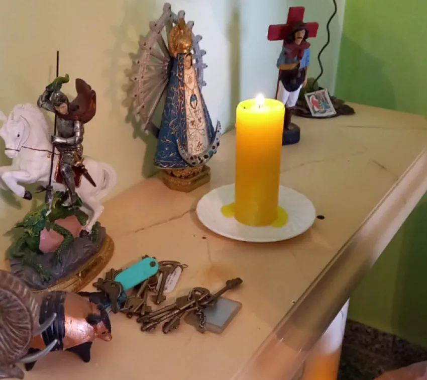 Durante los múltiples allanamientos descubrieron un curioso altar en el que había una vela encendida junto a tres santos y un manojo de llaves.