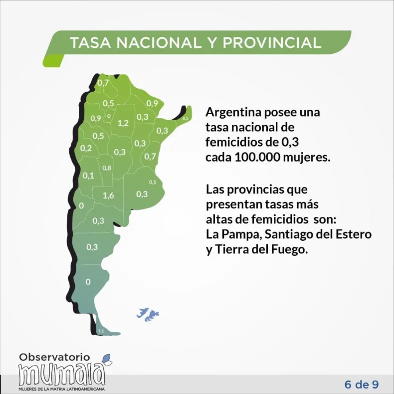 Asimismo, el informe reveló que entre las provincias con tasas más altas de femicidios se encuentran: La Pampa (1,6), Santiago del Estero (1,2), y Tierra del Fuego (1,1).