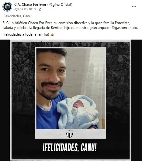 Si bien el pasado fin de semana For Ever perdió en condición de visita contra Deportivo Madryn, hay un integrante del equipo que esta semana esta de para bienes por una situación especial. Se trata del guardameta albinegro, Gastón Canuto, que ayer fue padre.