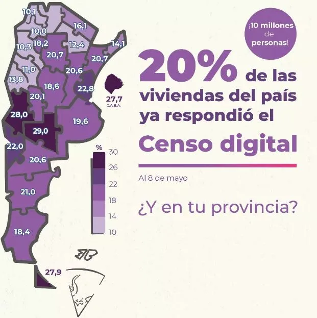 La cuenta oficial de Instagram del Censo Nacional de Población, Hogares y Viviendas 2022 publicó que, al 8 de mayo, un 20% de la población argentina contestó todas las preguntas del formulario digital, lo que representa alrededor de 10 millones de personas.