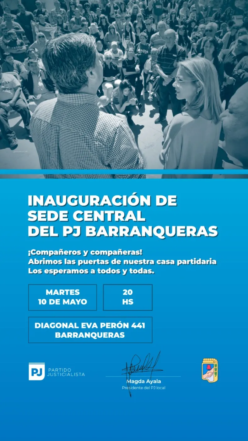 La intendente, Magda Ayala, invita a los compañeros y las compañeras a participar del acto de inauguración, que también contará con la presencia del gobernador Jorge Milton Capitanich. El local está ubicado en Diagonal Eva Perón 441.