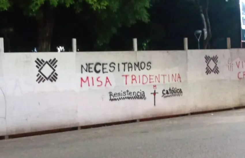 Este jueves aparecieron en la ciudad de Resistencia unas llamativas pintadas sobre los paneles que rodean a la Plaza 25 de Mayo. En los escritos se lee "necesitamos misa tridentina", y es firmado por el movimiento Resistencia Católica.