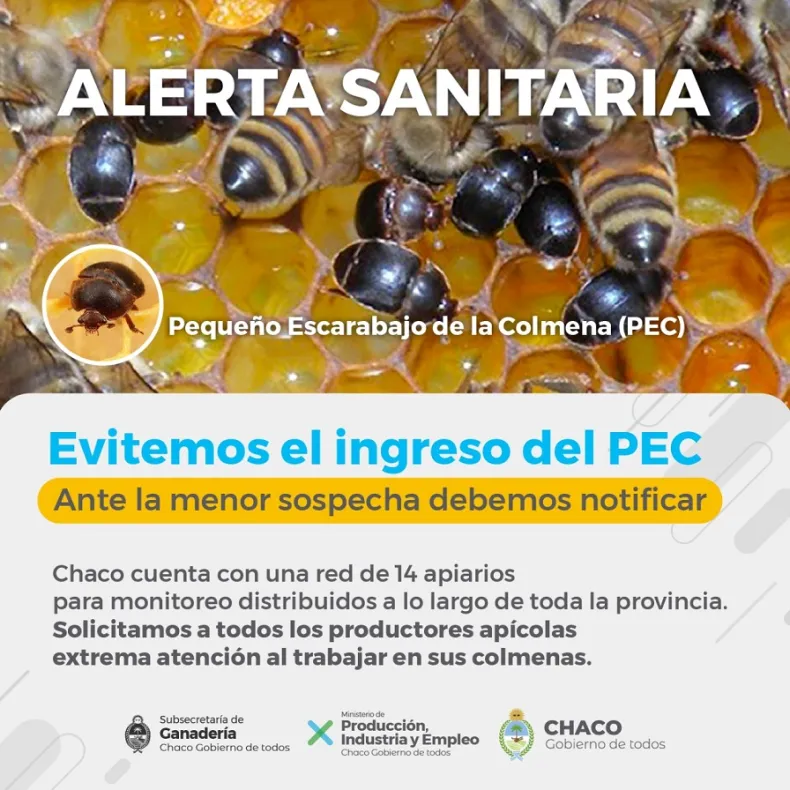 El Ministerio de Producción, Industria y Empleo emitió una alerta sanitaria y una solicitud dirigida a apicultores de toda la provincia para que procedan a notificar de manera inmediata la presencia, ante la menor sospecha posible, del pequeño escarabajo de las colmenas (PEC).