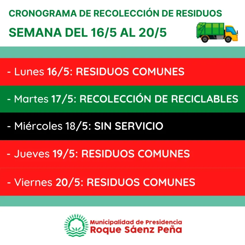 El miércoles 18 de mayo no habrá recolección de residuos en Sáenz Peña