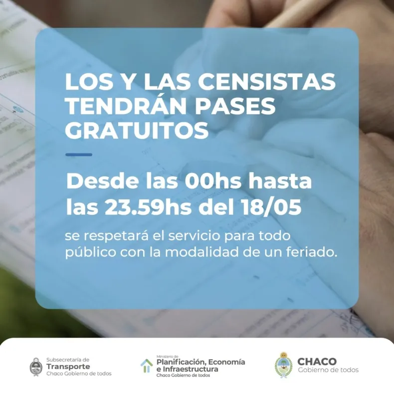 Este beneficio fue aprobado por resolución 238/22 del Ministerio de Transporte de la Nación y la Subsecretaría de Transporte del Chaco adhirió a través de la disposición 0212-22. De esta manera, todas las personas designadas como censistas por el Instituto Nacional de Estadística y Censo (INDEC) podrán circular de forma gratuita en todas las modalidades del transporte público de pasajeros que funcionan en el ámbito local.