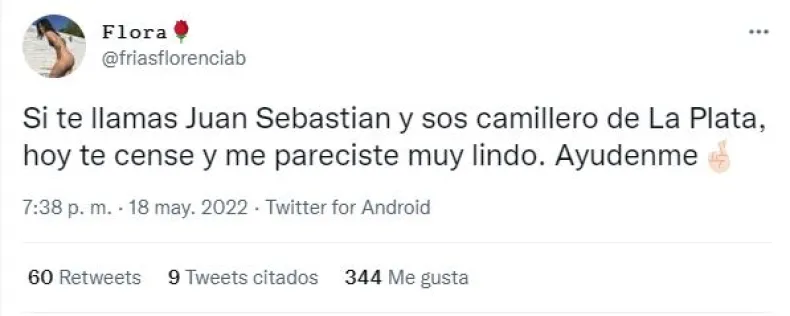 "Si te llamas Juan Sebastián y sos camillero de La Plata, hoy te censé y me pareciste muy lindo. Ayúdenme", escribió la joven en su cuenta de Twitter y la publicación se viralizó a los pocos minutos.