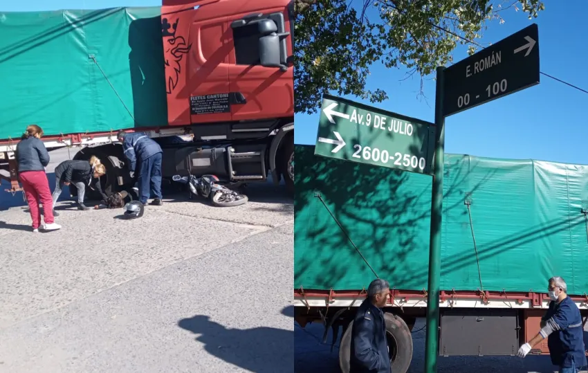 Una mujer mayor de edad circulaba en su motocicleta y terminó debajo de un camión, que pretendía doblar en Avenida 9 de Julio e intersección con la calle Emilio Román.