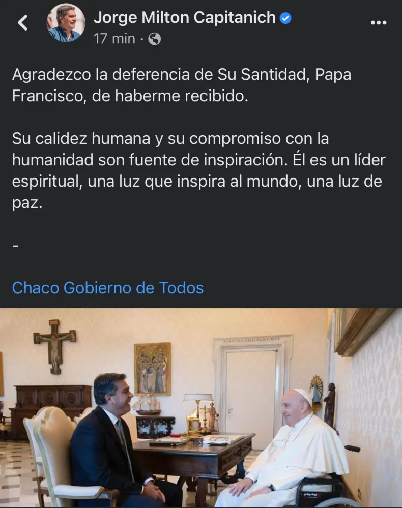 Siguiendo esta línea, el mandatario chaqueño realizó un posteo en sus redes sociales y agradeció la reunión. "Agradezco la deferencia de Su Santidad, Papa Francisco, de haberme recibido. Su calidez humana y su compromiso con la humanidad son fuente de inspiración. Él es un líder espiritual, una luz que inspira al mundo, una luz de paz", detalló en Facebook.