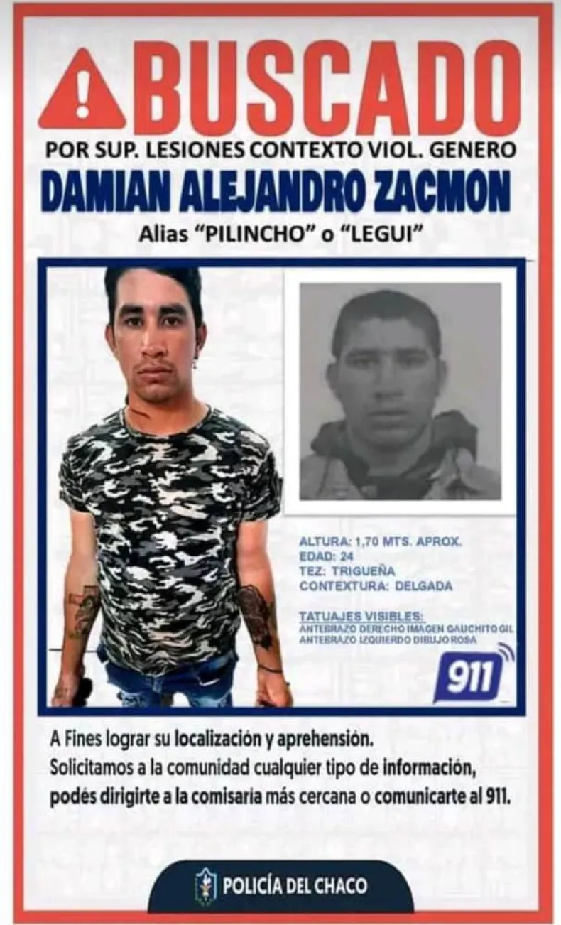 Damián Alejandro Zacmon, alias "pilincho" es buscado intensamente por la Policía del Chaco luego de golpear salvajemente a su ex pareja y madre de su hijo. La mujer agredida tiene 35 años y se supo que es una paciente de salud mental.