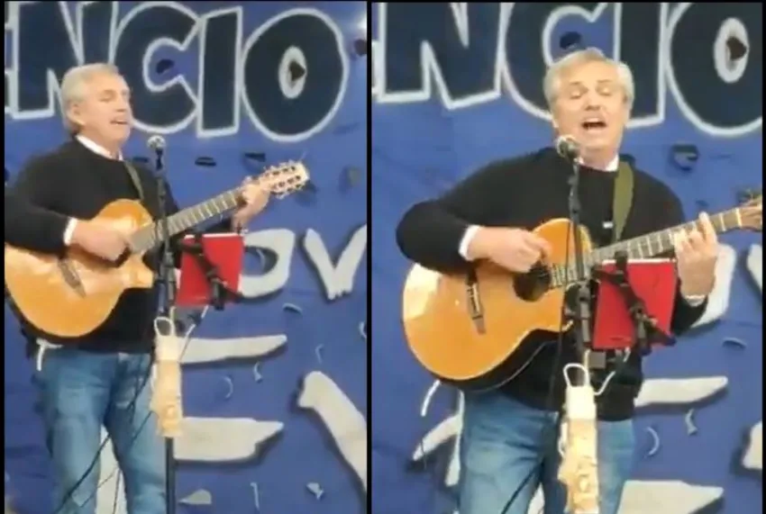 En ese contextó, Fernández subió al escenario que estaba ubicado en el club en el cual el almorzó para tocar y cantar una canción de Nebbia frente a los celulares de los militantes que grabaron el momento.