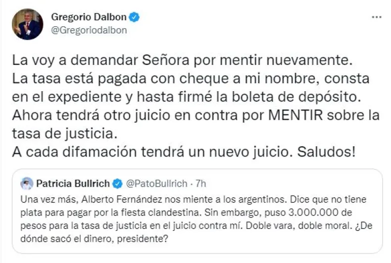 El abogado del presidente, Gregorio Dalbón, respondió a las acusaciones en la misma red social, citando el tweet, aseguró que la va a demandar "por mentir nuevamente". "La tasa está pagada con cheque a mi nombre, consta en el expediente y hasta firmé la boleta de depósito", explicó.
