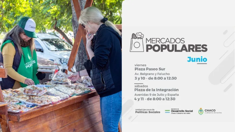 El Ministerio de Desarrollo Social informa que en la primera quincena de junio vuelve la propuesta de los Mercados Populares para estimular el consumo a buen precio e impulsar las unidades productivas a emprendedores chaqueños.