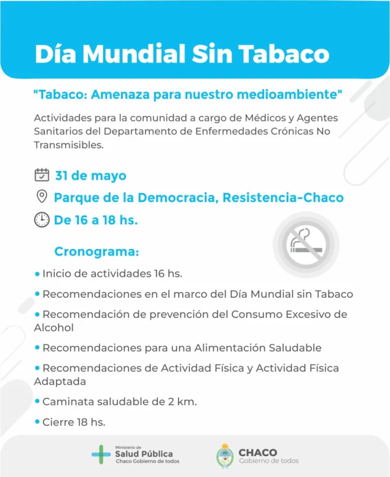 El Ministerio de Salud Pública del Chaco adhiere a la conmemoración del Día Mundial Sin Tabaco que se celebra en todo el mundo cada 31 de mayo. Esta celebración anual informa acerca de los peligros que supone el consumo de tabaco, las prácticas comerciales de las empresas tabacaleras, las actividades de la Organización Mundial de la Salud (OMS) para luchar contra el tabaquismo, y reivindicar el derecho a la salud y a una vida sana, y proteger a las futuras generaciones.