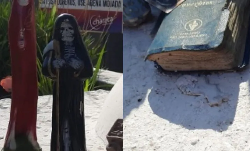 Rosana González es una mujer que vive en la localidad de Charata y se tomó el tiempo para ir a visitar a familiares fallecidos en el cementerio Padre Juan Holzer. Pero cuando llegó hasta el panteón, se topó con una sorpresa muy grande, había estatuillas de "San La Muerte", cruces y vírgenes decapitadas junto a la imagen de cristo.