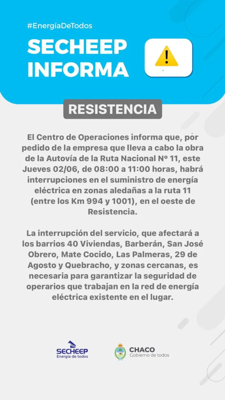 La información fue brindada por el propio Centro de Operaciones a través de la red social de Twitter de Secheep, donde comunican que por pedido de la firma que ejecuta la obra en la Autovía de la Ruta Nacional N° 11, hoy jueves, a partir de las 8 hasta las 11 horas, habrá interrupciones en el suministro eléctrico entre los kilómetros 994 y 1001.