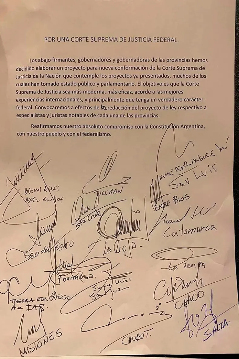 La reunión se llevó a cabo en el salón Eva Perón y fue a "agenda abierta", aunque el tema más relevante fue el proyecto de ampliación de la CSJ, como habían anticipado en la última reunión los gobernantes provinciales.