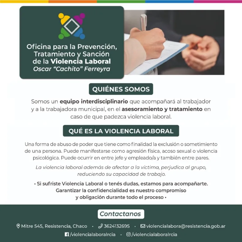 En tal sentido, manifestó que la sede de esta Oficina de Violencia Laboral, recientemente inaugurada, se encuentra en calle Mitre 545, pudiendo también los interesados llamar al celular 3624-132695, contando con asesoramiento de un abogado, un psicólogo, un mediador y un psicólogo social.