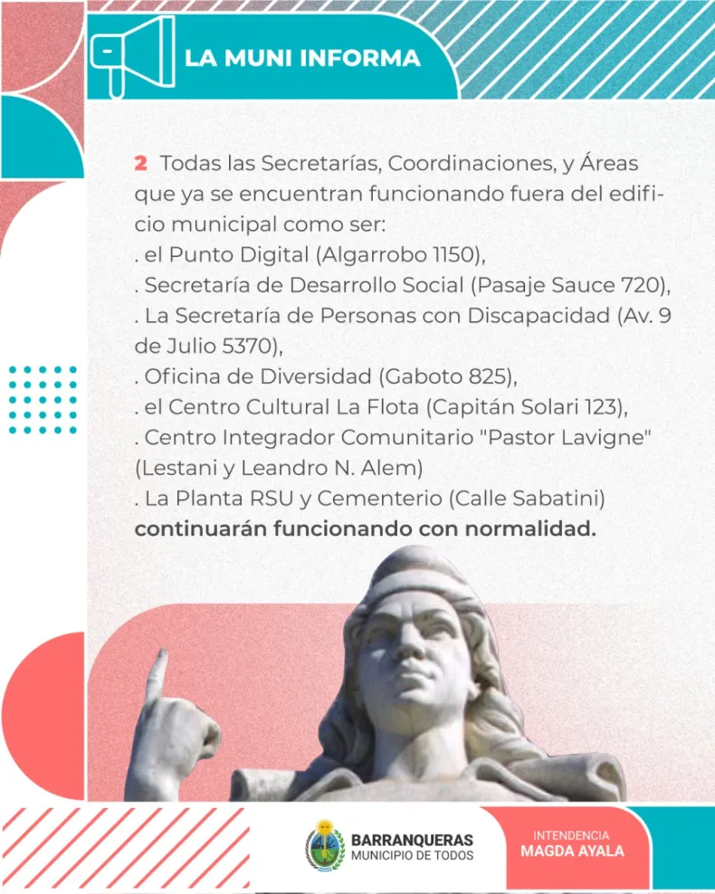 Desde la Municipalidad de Barranqueras se informa a la comunidad que desde el día 06 de junio y hasta el 10 de junio inclusive el cumplimiento de tareas y actividades de los espacios que se nombran seguidamente, estarán con guardias pasivas ya que se encontraban transitoriamente funcionando en la planta baja del edificio municipal, reintegrándose el día 13 de junio en los lugares reasignados que próximamente se estarán informando.