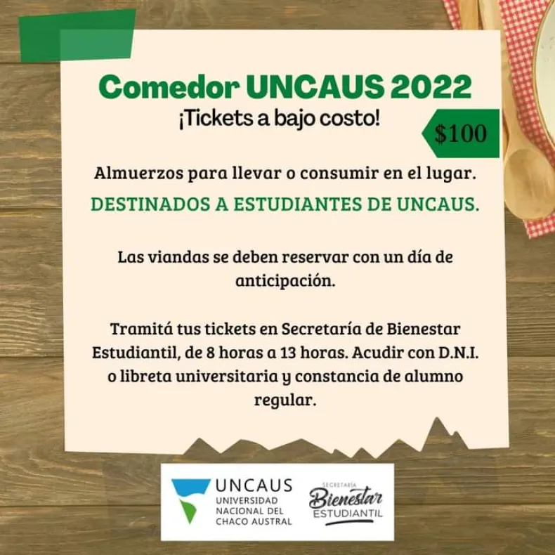 La Universidad Nacional del Chaco Austral (UNCAUS), creó un sistema de venta de tickets a bajo costo, para que estudiantes de carreras presenciales de pregrado y grado de la institución, y también del Nivel Superior de la U.E.G.P. Nº 188 "Chaco Austral", puedan adquirir almuerzos y continuar con sus estudios. El costo del ticket es de $100 y le permite a cada alumno retirar la vianda o comer en las instalaciones del comedor universitario.