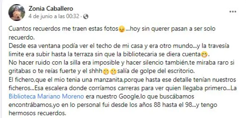 "Cuantos recuerdos me traen estas fotos...hoy sin querer pasan a ser solo recuerdo", comienza el post que está acompañado de varias fotos de archivo de la "Biblioteca Popular". "No hacer ruido con la silla era imposible y hacer silencio también, té miraba raro si gritabas o te reías fuerte y el shhh...salía de golpe del escritorio", recuerda.