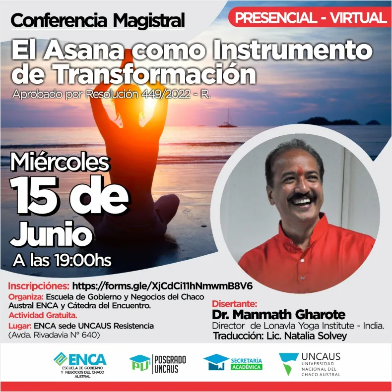 La Universidad Nacional del Chaco Austral (UNCAUS), a través de la Escuela de Gobierno y Negocios Chaco Austral (ENCA), y Secretaría Académica- Área de Posgrado, invita a participar de esta nueva propuesta que se podrá ver de manera presencial o virtual, a cargo del director de Lonavia Yoga Institute- India, Manmath Gharote.