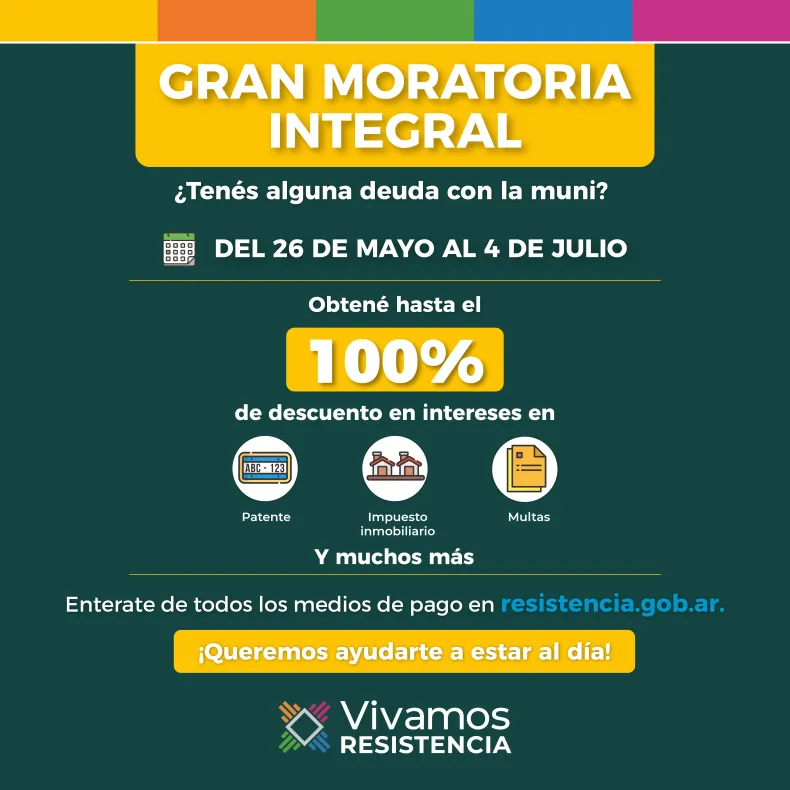 La Municipalidad de Resistencia brindará hasta el 4 de julio, y de manera excepcional, un régimen especial de facilidades de pago con descuentos de hasta el 100% de los intereses en todas las deudas que hayan contraído los contribuyentes, y que incluye las obligaciones tributarias no prescritas vencidas al 28 de febrero de 2022.