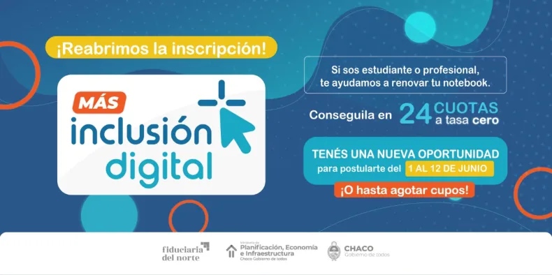 El Ministerio de Planificación, Economía e Infraestructura recuerda que, hasta el domingo 12, continúa abierta la inscripción al programa "Más Inclusión Digital", para que estudiantes universitarios o terciarios de instituciones públicas, profesionales en relación de dependencia o monotributistas, puedan acceder a créditos no bancarizados a tasa cero para la adquisición de computadoras portátiles en 12, 18 y 24 cuotas.
