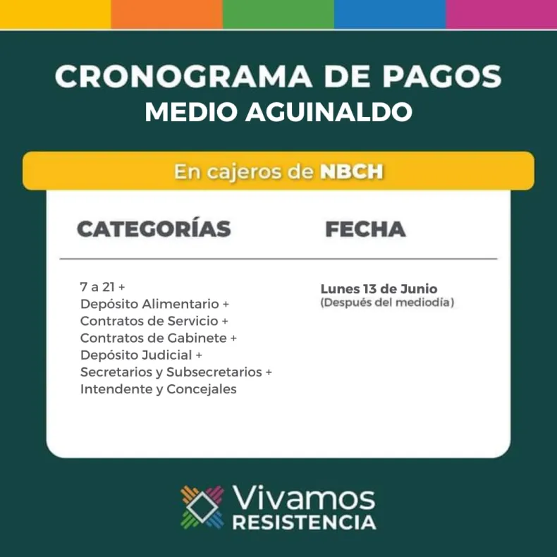 La Municipalidad de Resistencia informó que el próximo lunes 13 de junio, después del mediodía, estará depositado en los cajeros del Nuevo Banco del Chaco el medio Sueldo Anual Complementario para el personal municipal.