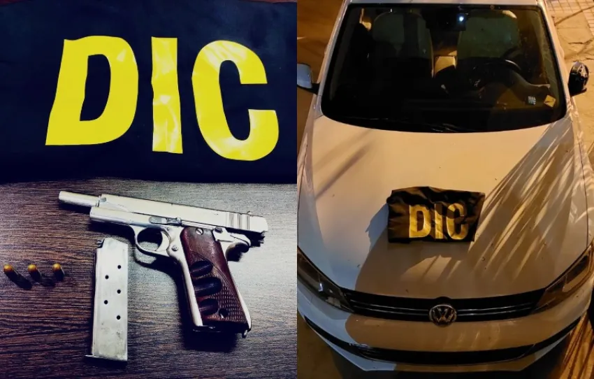 Allí, identificaron a estas personas, siendo tres hombres, uno de 34 y dos de 30 años. Luego inspeccionaron el interior, hallando un arma de fuego tipo pistola calibre 45mm.