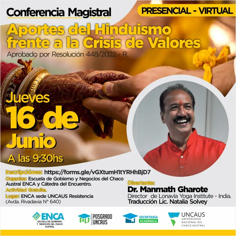 La Universidad Nacional del Chaco Austral (UNCAUS), a través de la Escuela de Gobierno y Negocios Chaco Austral (ENCA), y Secretaría Académica- Área de Posgrado, invita a participar de esta nueva propuesta que se podrá ver de manera presencial y virtual, a cargo del director de Lonavia Yoga Institute- India, Manmath Gharote.