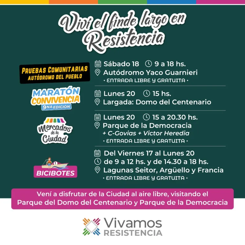 El municipio de Resistencia impulsa una variada oferta para que los vecinos puedan disfrutar el fin de semana extra largo en la Ciudad. Los eventos deportivos, culturales, sociales y recreativos serán con entrada libre y gratuita.