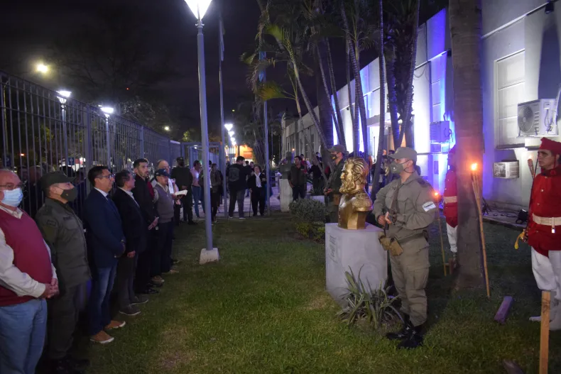 Allí se realizó el izamiento de la bandera nacional, se encendió la llama votiva que representa un homenaje a quienes dieron la vida por la Patria. Y se desarrolló la tradicional vigilia "Guardia bajo las Estrellas", donde hubo cambio de guardia cada hora frente al busto al héroe salteño ubicado en el frente de la Municipalidad.