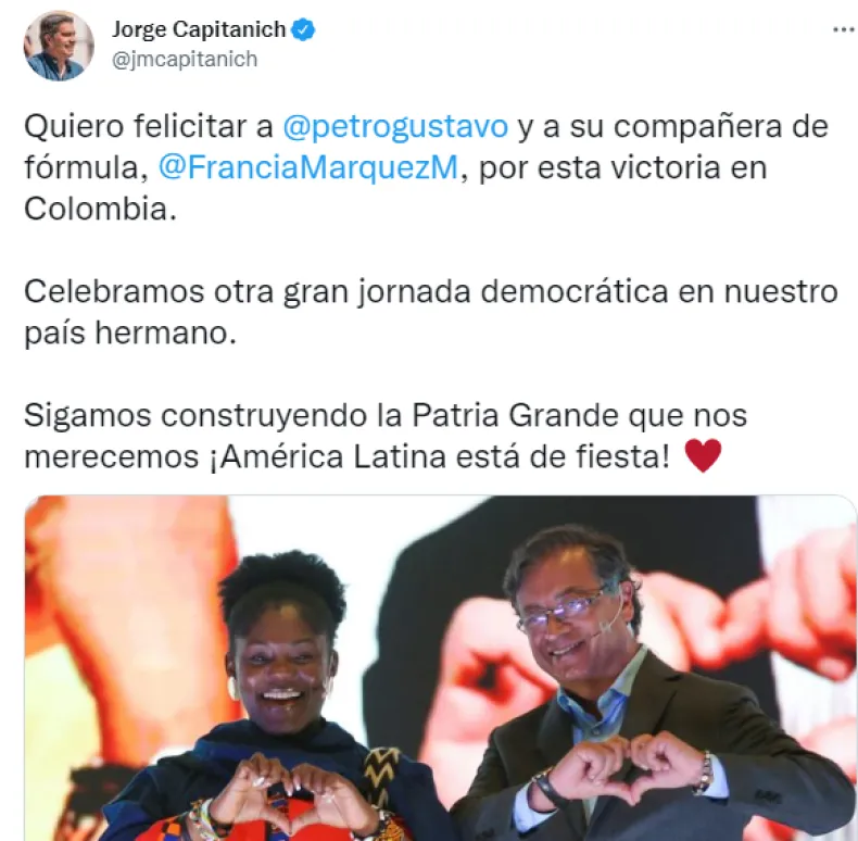 "Quiero felicitar a Gustavo Petro y a su compañera de fórmula, Francia Márquez, por esta victoria en Colombia. Celebramos otra gran jornada democrática en nuestro país hermano.