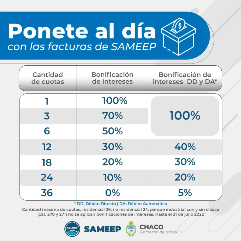 Sameep informa a los usuarios que continúa abierta la posibilidad de adherirse a planes de pagos para todos los que se encuentren con situación de deuda al 31 de marzo de 2022. La campaña "Ponete al Día" es válida para todas las localidades de la provincia, con excepción de Charata que ya cuenta con un plan de moratoria vigente.