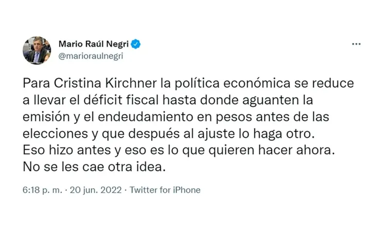 Por otra parte, el diputado nacional Mario Negri manifestó: "Para Cristina Kirchner la política económica se reduce a llevar el déficit fiscal hasta donde aguanten la emisión y el endeudamiento en pesos antes de las elecciones y que después al ajuste lo haga otro. Eso hizo antes y eso es lo que quieren hacer ahora. No se les cae otra idea".